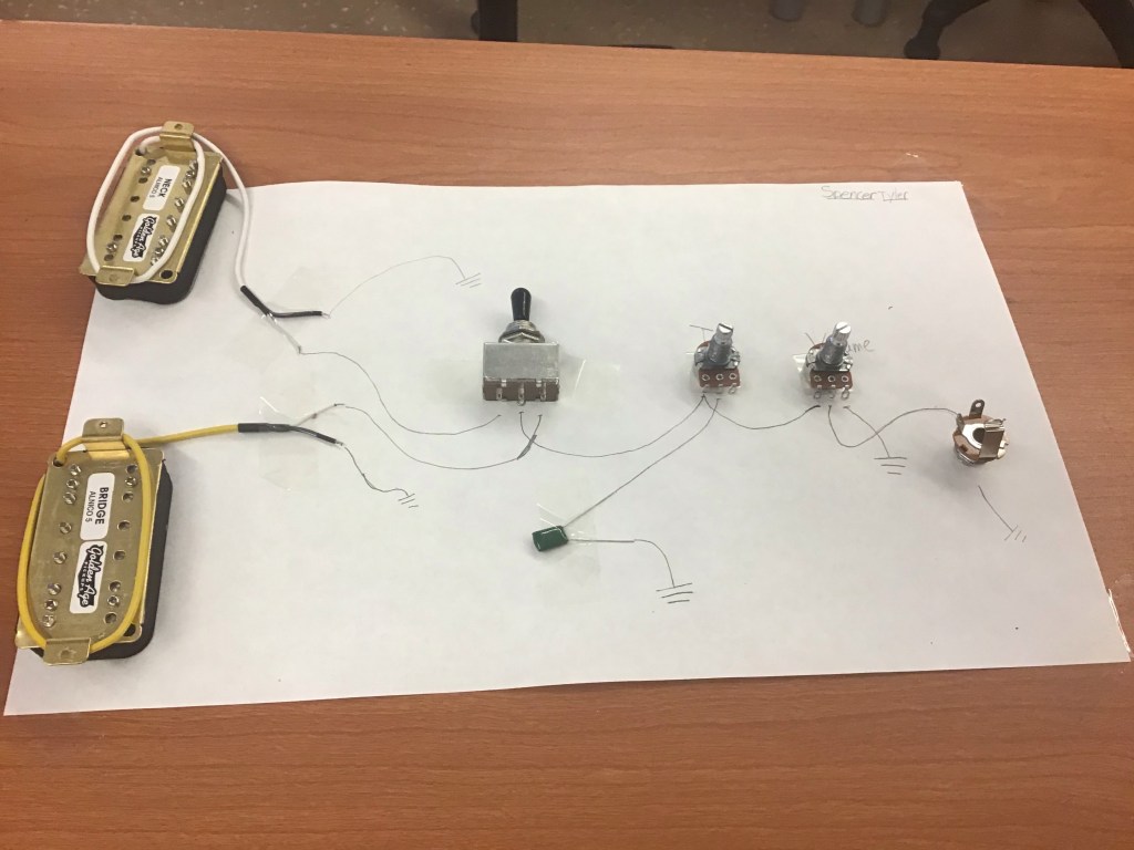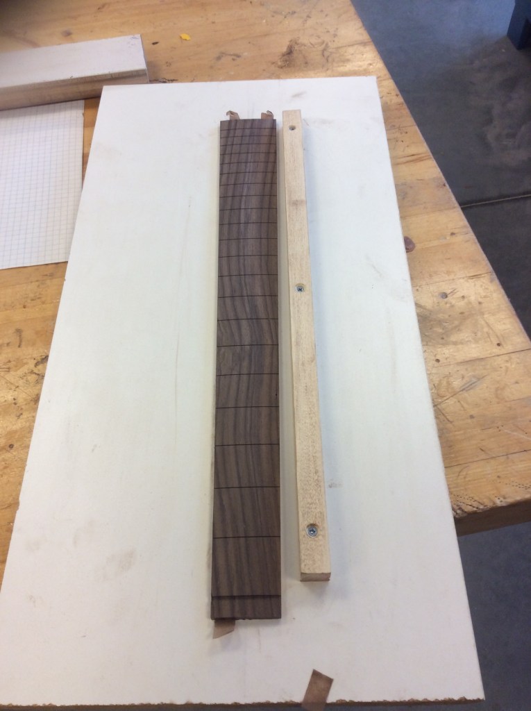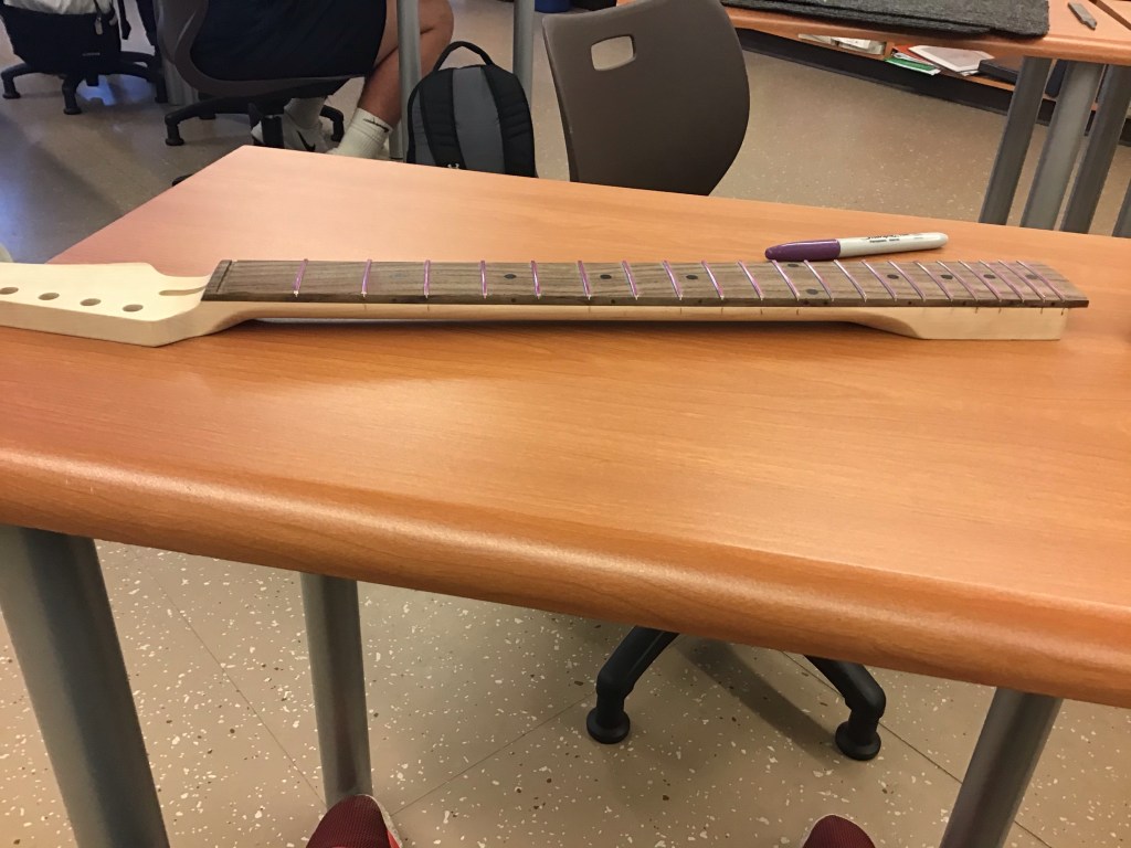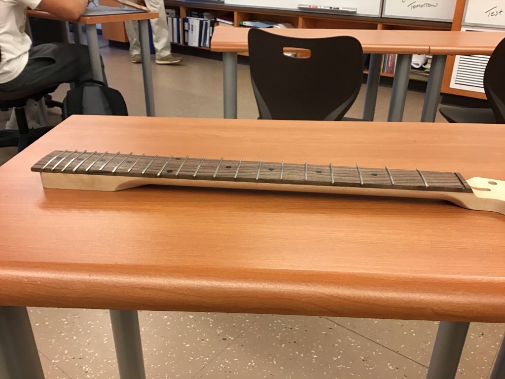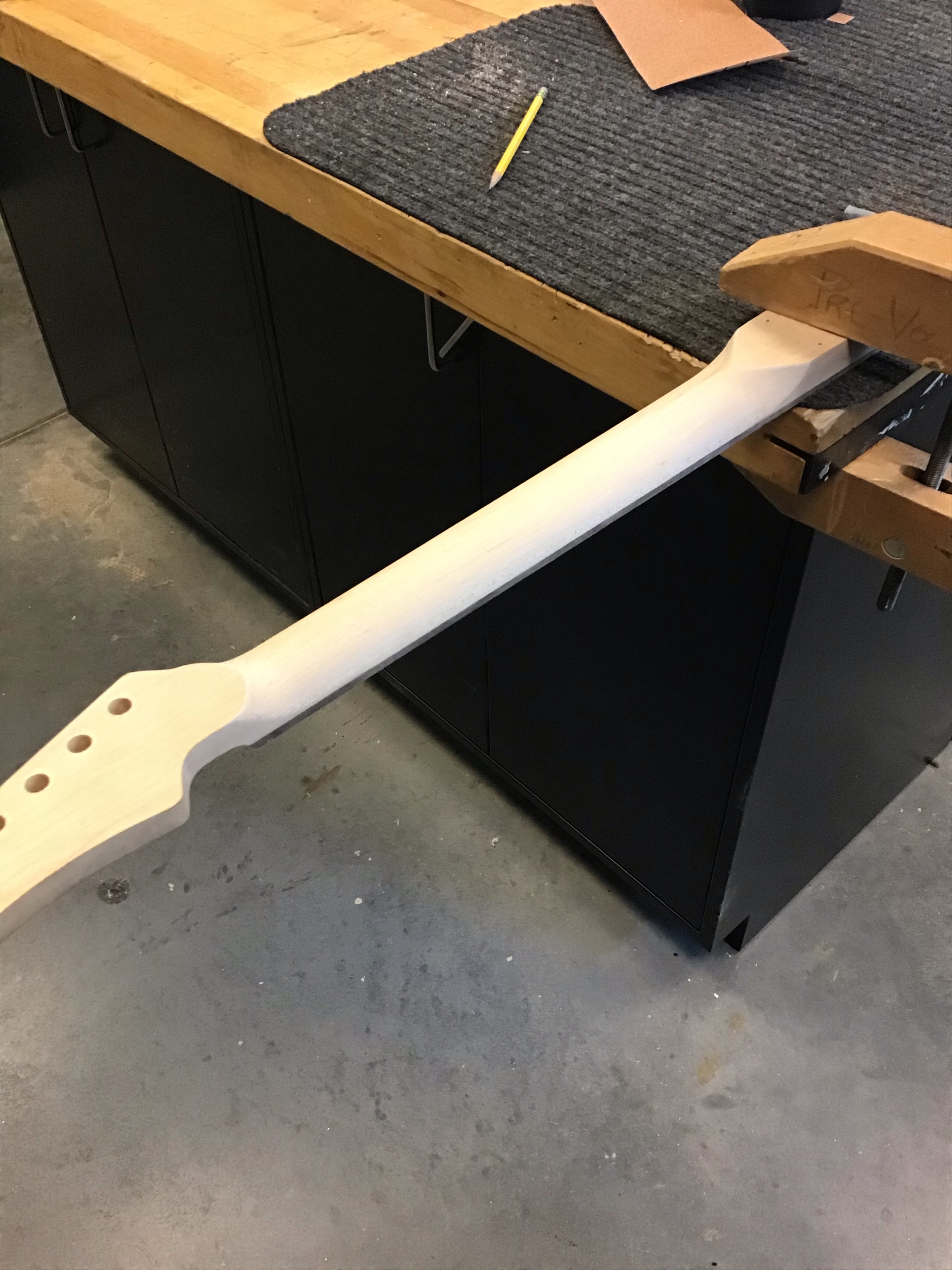 This week I used a sanding sealer on both body and neck to get ready for finish. I also installed a hook and handle for spraying. I used cordless drill,watered down clear finish for the sanding sealer, and 320 sanding paper to sand back the sanding sealer. I learned that sanding sealer is important to have a flat surface for our top finish.